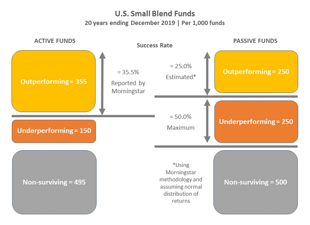 Continuing our focus on the U.S. Small Blend category, we observe that, for the 20-year period ending June 30, 2019, the passive fund survivorship rate is 50.0%. Therefore, the maximum success rate for these funds is 50.0%.